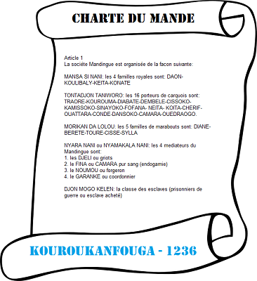 Après la bataille de Kirina et la capitulation sans condition du royaume de Sosso, les Mandenka et leurs alliés se reunirent en 1236 à Kourokanfouga où ils adopterent de facon consensuelle une Charte pour regir la vie de ce qui va plus tard s'appeler L'EMPIRE DU MALI.